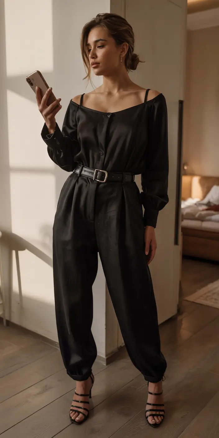 Accessories should complement the outfit’s smooth elegance rather than overpower it. Delicate gold or silver jewelry can add subtle sparkle, while classic heels or pointed boots create a clean and polished finish. A small clutch or shoulder bag in black leather keeps the look cohesive and refined. Hairstyles that feel sleek and effortless, such as a low bun or soft waves, complete the overall appearance beautifully. The silky all black outfit proves that simplicity combined with luxurious fabric can create a powerful statement that feels perfect for almost any evening occasion.