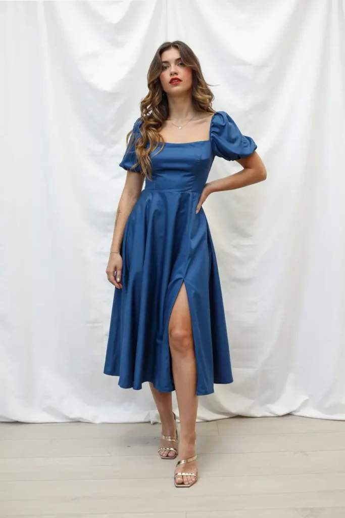Blue puff sleeve dresses bring playful romantic charm to wedding guest fashion by combining youthful sleeve structure with timeless pastel elegance suitable for spring celebrations. Soft shades such as baby blue, cornflower blue, and powder blue remain trending in 2026 wedding guest styling because they reflect seasonal freshness while maintaining refined sophistication. Lightweight chiffon, organza, or satin-blend fabrics enhance puff sleeve silhouettes by creating soft shoulder volume that feels elegant rather than dramatic. These dresses often feature midi or ankle-length hemlines that maintain graceful modest styling appropriate for formal wedding events.