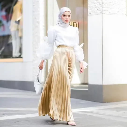 A monochrome outfit in soft neutrals like beige, taupe, or ivory feels calm, elevated, and timeless. Matching your top, skirt, and hijab within the same color family creates a seamless, elongated silhouette perfect for evening wear.