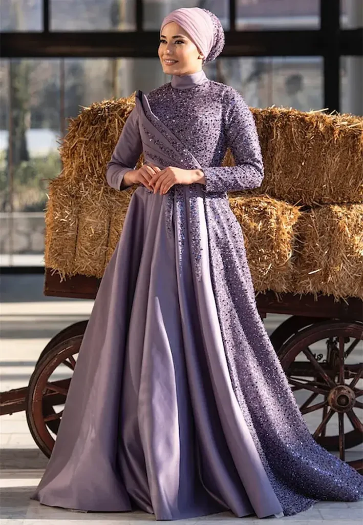 Style this dress with neutral heels and a soft hijab style to balance the details. This look is ideal for engagement parties, formal dinners, or festive night events.