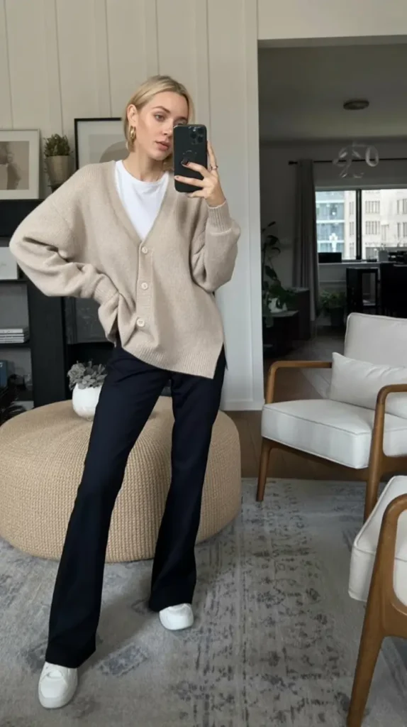 The silhouette of this outfit focuses on relaxed layering that balances fitted leggings with flowing cardigan movement to create flattering proportions. High-waisted leggings provide streamlined structure while oversized cardigans introduce cozy volume that enhances comfort without appearing bulky. Lightweight cotton or wool-blend knit tops add breathable warmth while maintaining effortless spring styling. Soft earthy tones such as sand, oatmeal, or warm taupe enhance rustic aesthetics while allowing versatile outfit coordination. Stretch leggings provide flexibility while layered knit fabrics preserve comfortable seasonal wear.