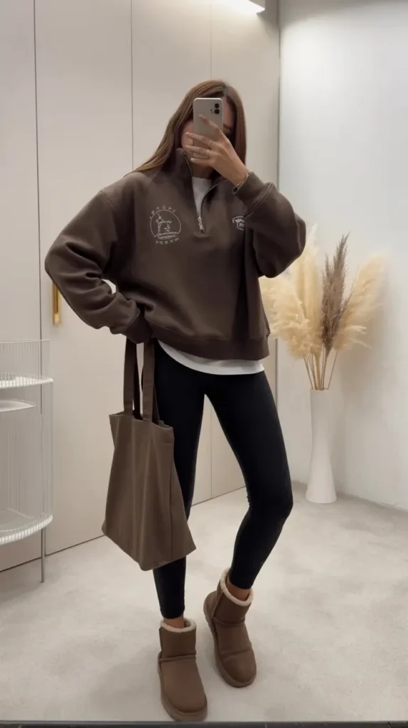The silhouette of this outfit focuses on layered tonal harmony that enhances both warmth and flattering structure. Cocoa leggings provide a slimming foundation while layered neutral tops introduce softness and visual dimension. Oversized or relaxed knit sweaters enhance cozy comfort while maintaining breathable wearability for mild spring temperatures. Cardigans or flannel shirts can be styled open or belted to create varied silhouette styling while preserving rustic charm. Stretch knit fabrics and lightweight layering materials ensure movement flexibility while maintaining polished seasonal appearance.