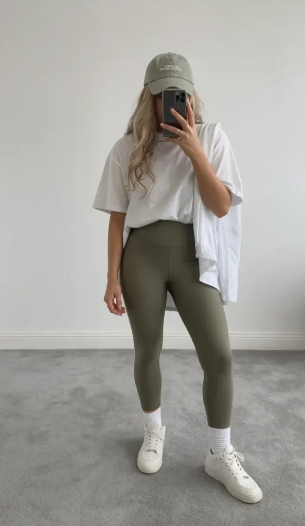 Earthy green leggings styled with minimalist neutral layers create a calm and sophisticated spring outfit that highlights natural countryside simplicity. This outfit typically features olive, moss, or forest green leggings paired with crisp white tops, lightweight linen shirts, or simple knit sweaters that create clean tonal contrast. The earthy green palette reflects blooming spring landscapes while maintaining elegant minimalist styling. This outfit is ideal for outdoor walks, casual workdays, or relaxed social meetups that require polished yet effortless fashion.