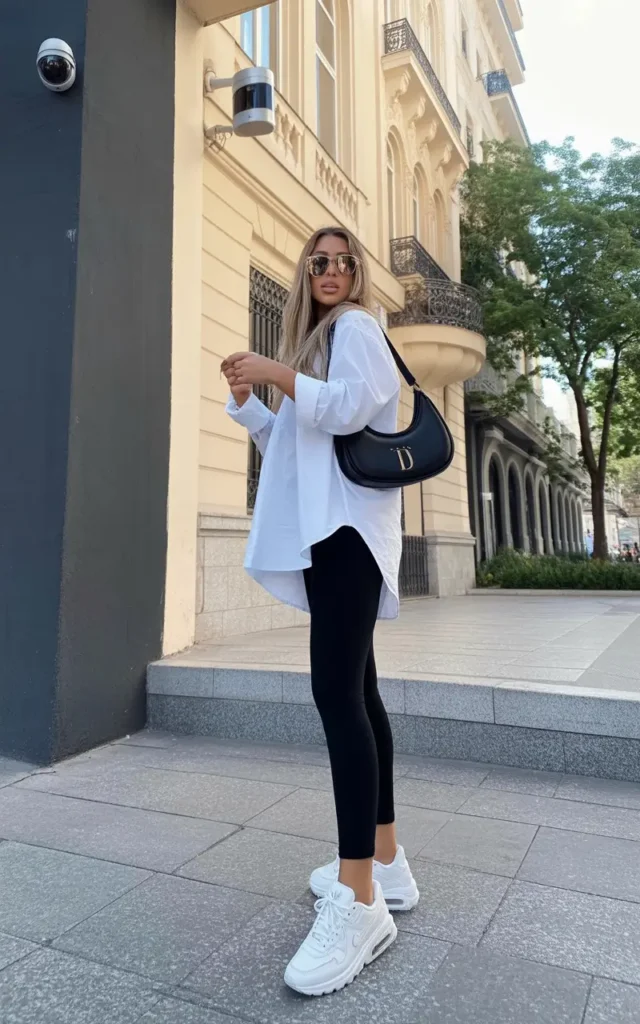 The silhouette of this outfit focuses on structured layering that enhances graceful movement while preserving effortless simplicity. High-waisted leggings create streamlined balance while layered white garments introduce volume through breathable textures such as cotton poplin, linen blends, or fine knit materials. Oversized white shirts or soft tailored blouses add relaxed elegance while maintaining flattering proportions. Rustic color leggings ground the brightness of white layering while creating balanced visual contrast. Breathable fabrics ensure comfort during warmer spring afternoons while preserving sophisticated styling.