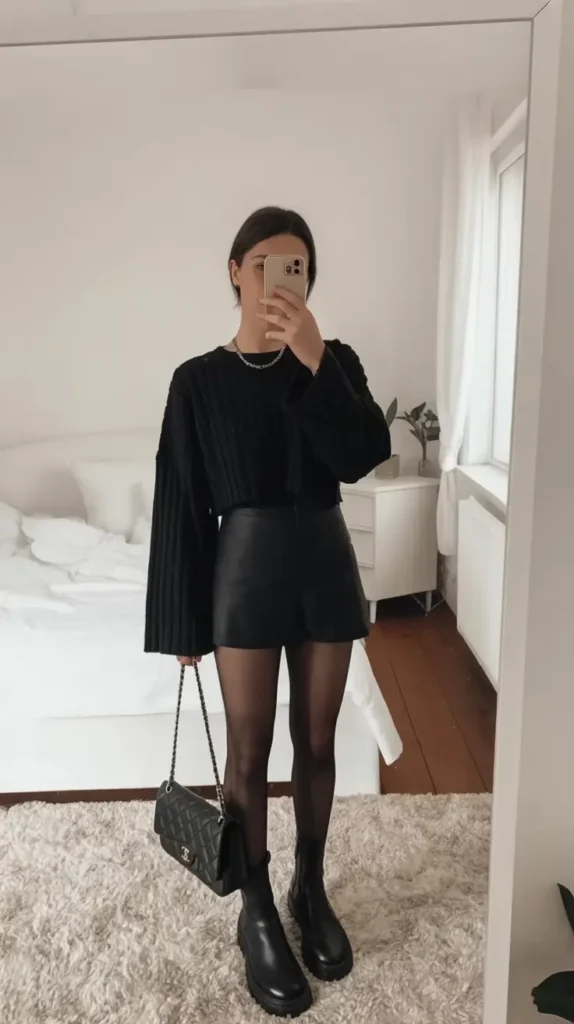 This outfit thrives in evening date settings such as candlelit restaurants, outdoor patios, or scenic countryside drives during sunset hours. The layered leather and knit combination provides both warmth and dramatic visual contrast that stands out beautifully in low evening lighting. The outfit’s rich textures create dimension that photographs elegantly against rustic wooden interiors or natural spring landscapes. This styling captures emotional warmth and confident romance while maintaining practical comfort, making it a perfect choice for memorable spring date nights filled with cozy atmosphere and stylish sophistication.