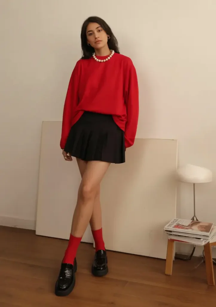 Footwear can support the playful yet balanced nature of this outfit by incorporating neutral ankle boots, soft ballet flats, or minimalist heels that allow the red tones to remain the primary focus. Accessories should complement the outfit’s warmth through textured handbags in tan, woven materials, or soft leather finishes. Jewelry works best when delicate and radiant, incorporating gold accents or small gemstone details that enhance the vibrancy of red without creating excessive contrast. Hairstyles such as loose waves, soft curls, or relaxed ponytails add movement and reinforce the outfit’s youthful romantic personality.