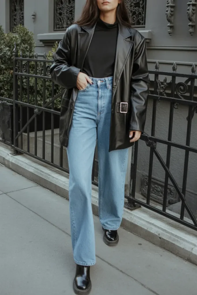 Footwear plays an important role in maintaining the outfit’s confident yet practical energy. Heeled ankle boots, platform boots, or sleek leather sneakers complement the layered styling while supporting extended evening plans. Accessories should focus on reinforcing the bold urban aesthetic through structured leather handbags, compact crossbody bags, or minimalist belt details. Jewelry can remain strong yet refined through layered chains, statement rings, or medium-sized hoops that enhance personality without overpowering the outfit’s texture contrast. Hairstyles such as tousled waves, textured ponytails, or sleek straight styles support the outfit’s modern attitude.