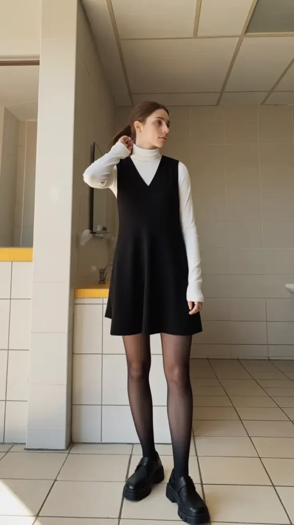 Footwear plays a crucial role in completing this polished outfit while preserving seasonal comfort. Pointed ankle boots, sleek heeled loafers, or minimalist heels enhance the tailored structure while maintaining ease of movement. Accessories should remain refined and intentional, such as a structured clutch or compact leather handbag that complements the outfit’s sleek lines. Jewelry can introduce subtle luxury through gold or silver layered necklaces, statement rings, or delicate drop earrings that enhance femininity without overwhelming the outfit’s sophisticated balance. Hair styled in soft waves, sleek straight layers, or an elegant ponytail supports the outfit’s refined energy.