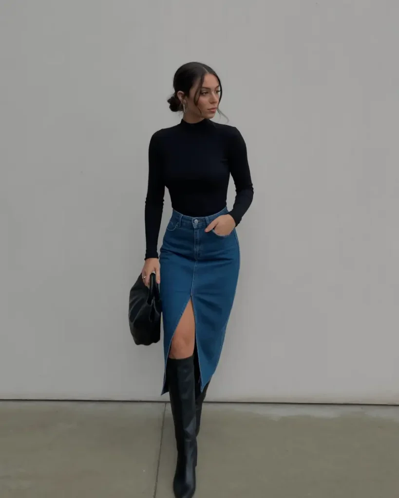 This outfit excels because it transitions effortlessly between casual and semi-formal date night plans. Whether attending a rooftop dinner, enjoying a countryside picnic, or visiting a spring festival, the black midi remains adaptable and photogenic. The clean silhouette highlights natural movement and creates elegant lines that appear effortless in photographs. This styling represents modern romantic minimalism that prioritizes comfort while still delivering visual impact. The combination of classic color and soft seasonal layering makes this outfit a reliable and stylish choice for rustic spring evenings.
