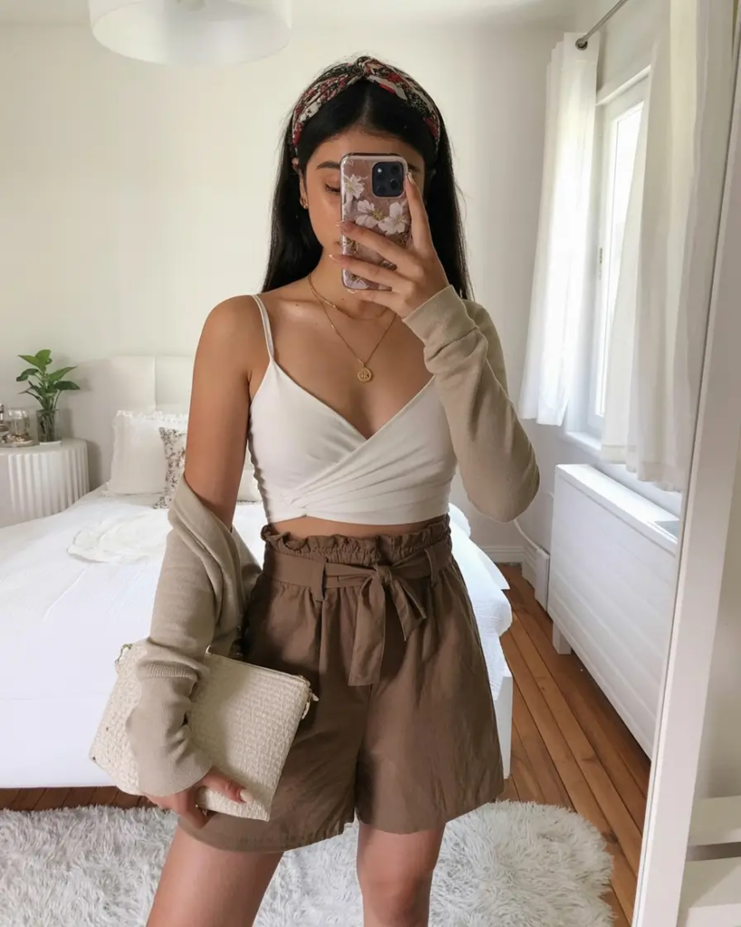 Tailored spring shorts balance the romantic nature of the top with structure and sophistication. Clean lines and soft neutral tones create a composed silhouette that feels modern and flattering. Lightweight materials ensure breathability, while minimal accessories and simple footwear keep the outfit cohesive. This style works beautifully for daytime gatherings, vacations, or stylish casual outings.