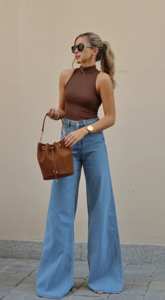 Rich brown tones bring warmth and depth to spring outfits, offering a sophisticated alternative to traditional neutrals. Brown tops in shades like chocolate, caramel, or warm mocha create a refined base that feels grounded yet stylish. When paired with wide-leg denim, this combination delivers a polished silhouette that feels modern and balanced. The contrast between structured tops and flowing denim adds movement while maintaining an elegant appearance.