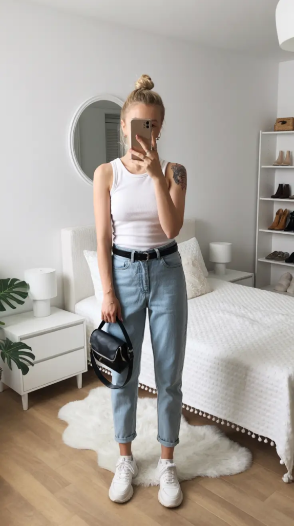 Classic denim styles such as straight-leg, relaxed, or high-waisted jeans work seamlessly with clean white tops. Light and mid-wash denim keep the look spring-appropriate, while minimal footwear and accessories enhance its ease. This outfit is ideal for everyday wear, casual meetups, or relaxed weekends where comfort and style go hand in hand.