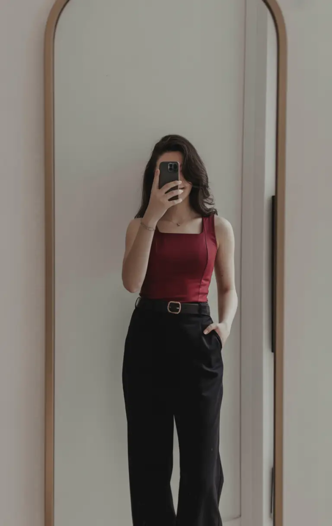 Pairing burgundy tops with tailored trousers, straight-leg jeans, or midi skirts enhances the overall polished feel. Neutral bottoms in beige, soft gray, or classic black allow the burgundy tone to stand out naturally. Simple accessories such as leather belts, minimalist jewelry, or structured bags complement the tailored aesthetic. This outfit style is perfect for spring days when you want to look put-together without sacrificing comfort or ease.