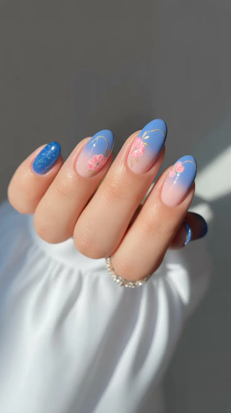 To create this soothing look, nail artists blend multiple shades of blue using a sponge or brush to achieve a smooth gradient. Once the base is set, floral patterns sometimes paired with subtle swirls or wave lines are delicately added to select nails. Fine detailing ensures the design remains elegant and understated, while glossy top coats enhance the gradient and protect the intricate artwork. This style works beautifully on medium-length nails, allowing enough space to showcase both gradient transitions and floral accents.