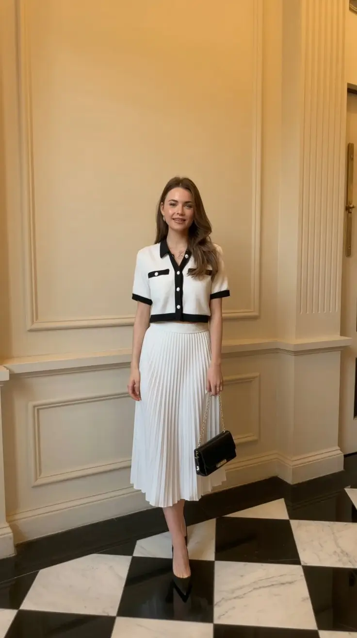 This outfit is perfect for occasions that call for a touch of sophistication, from summer gatherings to more formal daytime events. It carries a quiet charm that feels both classic and contemporary, making it a versatile addition to any wardrobe. The combination of pleated textures and feminine details creates a look that is both graceful and approachable. It is a beautiful representation of old money style, where elegance is expressed through simplicity and thoughtful design.