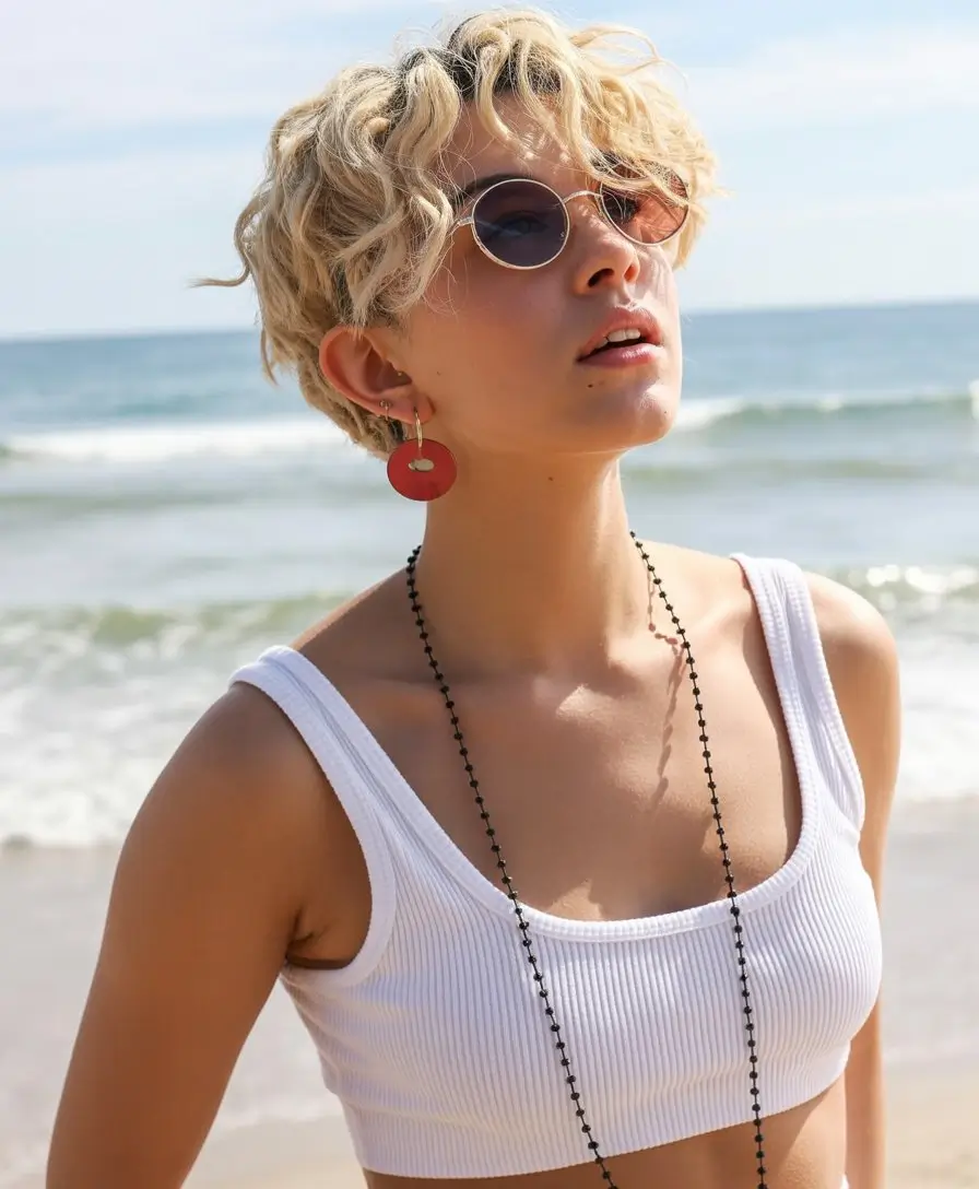 This haircut captures the carefree spirit of summer with its playful curls and naturally sun kissed finish that feels relaxed and full of personality. The curly beach pixie is designed to embrace texture rather than control it, allowing your natural curls or waves to take center stage. The shorter length keeps the style light and breathable, while the sun kissed tones add warmth and dimension that make the curls appear more defined and lively. It is a joyful, expressive look that feels perfectly suited for warm weather and outdoor days.