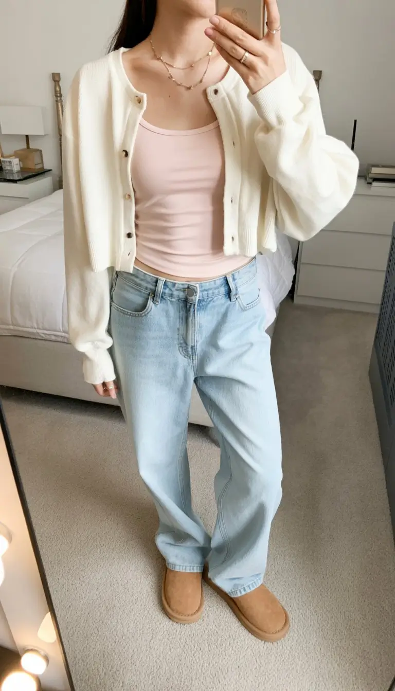 The styling of this outfit is simple yet effective, allowing you to build a look that feels natural and easy to wear. A fitted tank top or basic tee underneath the cardigan keeps the outfit light and breathable, while choosing light or medium wash jeans can enhance the soft aesthetic. Sneakers or simple flats work perfectly to maintain the relaxed vibe, and you can add small accessories like a claw clip, tote bag, or minimal jewelry to complete the clean girl look without overdoing it.