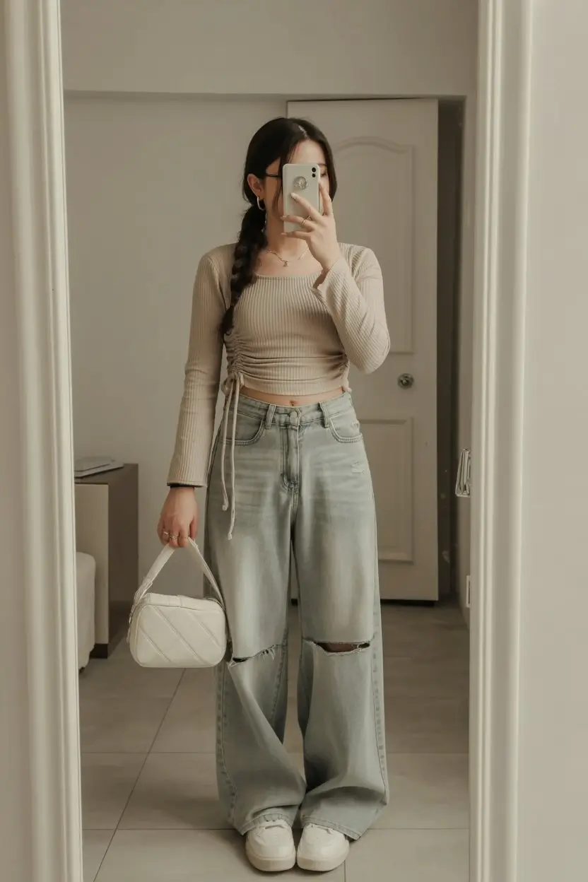 What makes this outfit appealing is its ability to feel both cozy and breathable at the same time. The long sleeve top offers a bit of coverage without feeling too warm, while the ripped jeans keep the outfit casual and slightly edgy. It is a great choice for teens who enjoy neutral aesthetics and want something versatile that can transition from day to evening with ease while still looking effortlessly stylish.