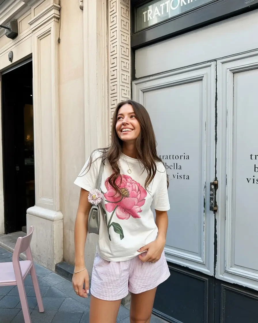 Styling this outfit is simple and enjoyable, allowing you to play with colors and textures without overthinking your look. You can choose shorts in neutral shades to balance the brightness of the floral tee or go for matching tones to create a more coordinated outfit. Sneakers, sandals, or slip on shoes work perfectly to complete the look, while accessories like a tote bag, sunglasses, or a cute hair accessory can enhance the playful vibe. The goal is to keep everything light and fun while maintaining comfort throughout the day.