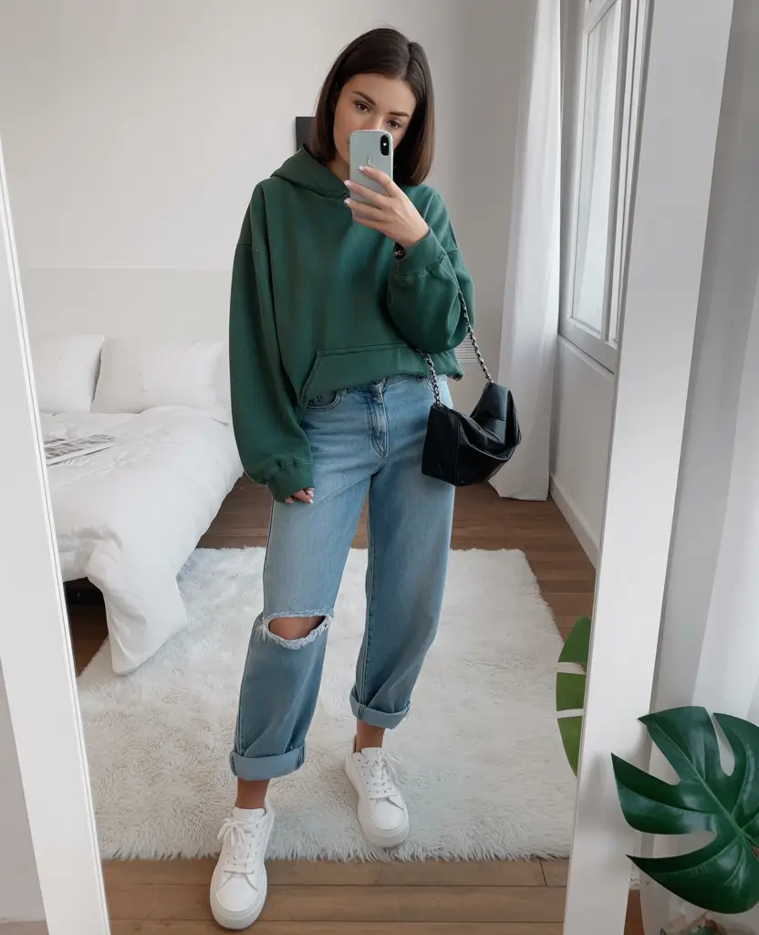 Relaxed Hoodie Energy With Playful Denim Ease captures the laid back spirit of modern mom style while still feeling current and stylish. A soft, well fitted hoodie offers unmatched comfort, especially on busy days filled with errands and quick transitions. Choosing a hoodie in fresh spring tones like soft sage, light pink, or creamy beige instantly updates the look for 2026. When paired with playful denim such as slightly distressed jeans or cropped straight legs, the outfit gains personality without feeling overly casual. The relaxed top contrasts beautifully with structured denim, creating balance between cozy and put together. This combination is perfect for casual coffee runs, weekend outings, or long days when comfort is your priority. The key is selecting a hoodie that fits well through the shoulders and arms so the outfit feels intentional rather than oversized.