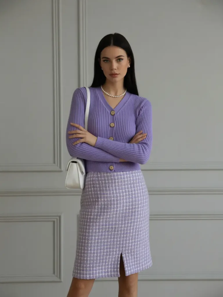 From a Pinterest perspective, lavender knit sets photograph beautifully and instantly capture attention due to their soft yet distinctive hue. The monochromatic coordination creates a cohesive and elevated visual impact that aligns perfectly with curated spring outfit boards. This look resonates strongly with modern professionals seeking fresh alternatives to traditional neutral office attire. The gentle color exudes approachability and confidence, making it suitable for collaborative work environments and client-facing roles alike. With small adjustments such as switching footwear or adding statement earrings, the outfit transitions effortlessly from office hours to after-work gatherings. Ultimately, a lavender knit set with a polished skirt represents modern femininity, seasonal freshness, and professional refinement for spring 2026.