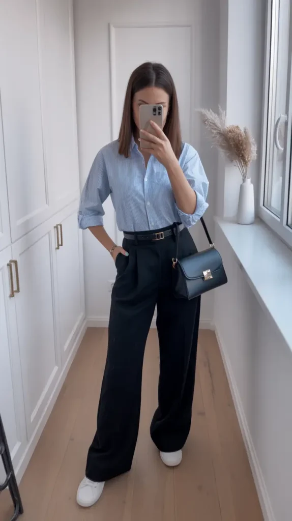 The strength of this outfit lies in its clean lines and precise tailoring. A well-fitted blue shirt tucked neatly into high-waisted black trousers creates a streamlined and elongating effect. Choosing breathable fabrics ensures comfort during long workdays while preserving a crisp appearance. Wide-leg trousers introduce a contemporary touch, while straight-leg cuts maintain classic appeal. Subtle details such as rolled sleeves or delicate jewelry can add personality without compromising professionalism. Layering with a tailored black or navy blazer enhances structure and authority for more formal settings. This combination remains versatile and adaptable, allowing simple adjustments to suit various workplace expectations.