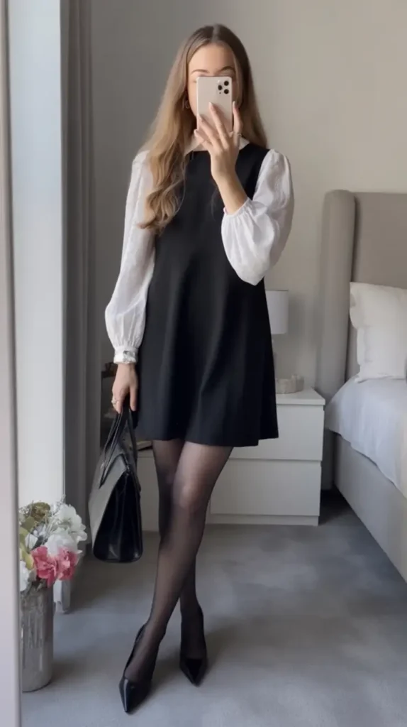 From a Pinterest perspective, monochrome black outfits with romantic sleeves create striking visual impact. The contrast between structured tailoring and soft sleeve detailing photographs beautifully, especially against neutral backdrops. This look resonates with modern professionals seeking bold yet sophisticated wardrobe options. The monochrome styling simplifies coordination while allowing the sleeve detail to stand out as a defining feature. With small adjustments like adding statement earrings or switching footwear, the outfit transitions effortlessly from daytime professionalism to evening elegance. Ultimately, monochrome black with romantic sleeves represents power, grace, and modern femininity within the evolving landscape of spring business casual style for 2026.