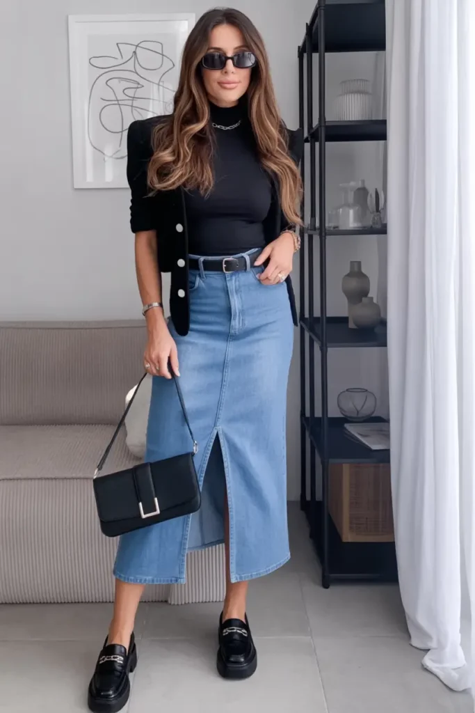 The strength of this outfit lies in its contrast between fabric textures and tailored structure. A high-waisted denim midi elongates the silhouette, especially when paired with a tucked-in black knit or blouse. Layering with a tailored black blazer enhances sharpness and ensures the ensemble remains business casual rather than weekend casual. Choosing darker denim tones keeps the look polished, while straight or A-line cuts maintain clean proportions. Accessories should remain refined and minimal to allow the contrast between denim and black tailoring to stand out. This combination demonstrates how classic wardrobe staples can be reimagined for contemporary professional settings without sacrificing elegance or comfort.