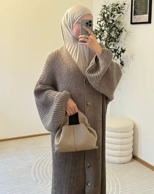 Pair this look with a matching hijab and ankle boots or flats. Layer with a long coat or cardigan during cooler months. This outfit idea is perfect for women who want cozy yet refined hijab styling.
