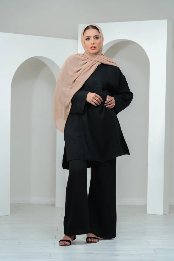 Linen sets are breathable, lightweight, and incredibly chic. A matching linen top and pants create a cohesive outfit that feels elevated with minimal effort. Soft earthy tones like sand, olive, or cream work beautifully with hijabs.