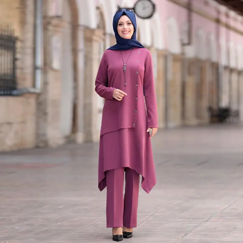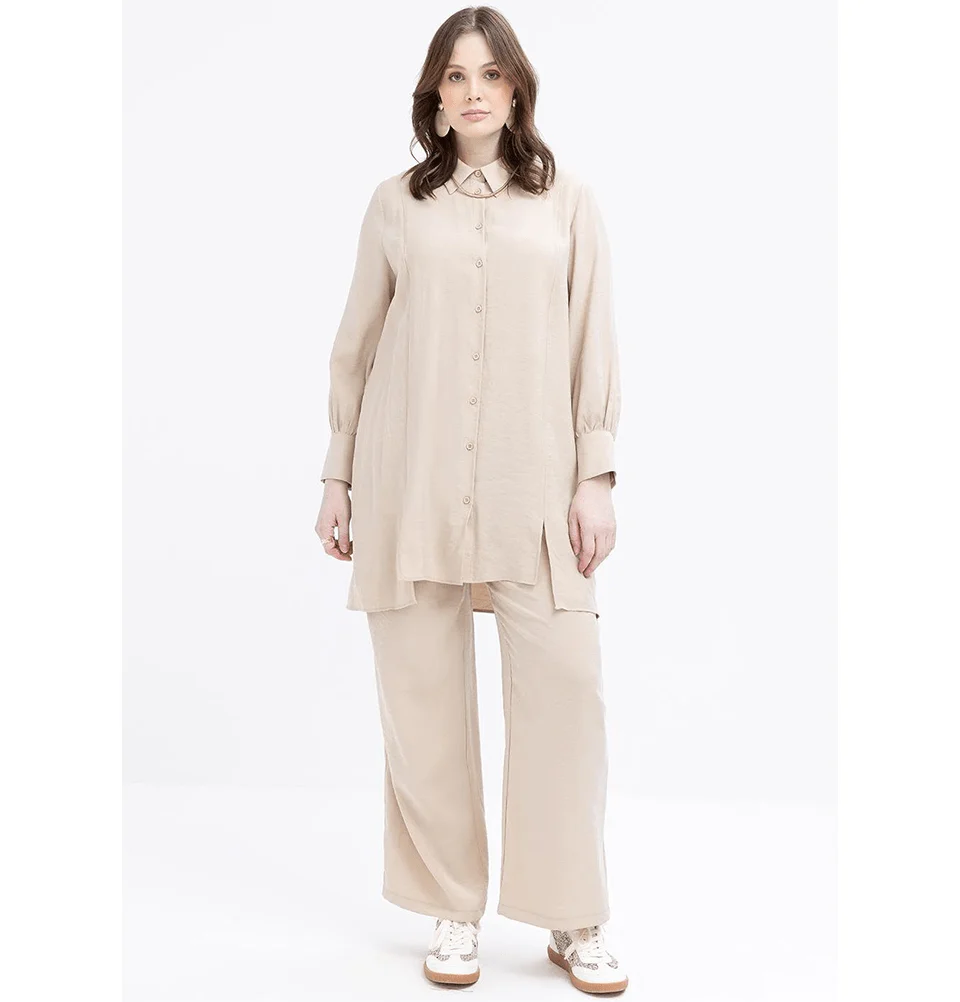 A flowy tunic paired with straight leg pants creates a flattering and modest silhouette. Tunics offer coverage while still allowing movement and comfort. This outfit works well for daily wear and can easily be dressed up or down.