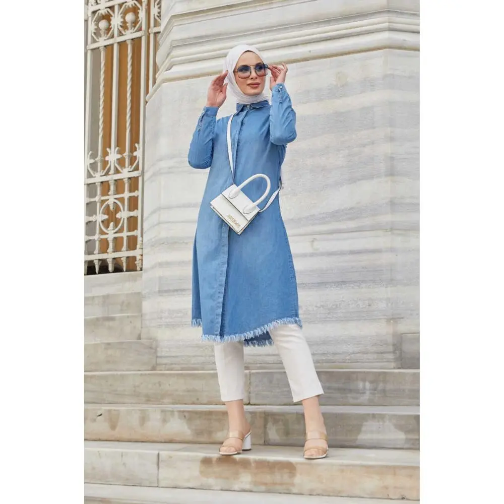 Denim paired with a long tunic is a timeless hijab outfit idea. Straight or relaxed-fit jeans provide comfort, while the tunic offers modest coverage without feeling bulky. Neutral or pastel hijabs soften the look and make it perfect for casual days.