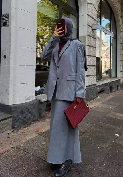 Finish the look with a structured bag and pointed flats. This hijab outfit idea transitions effortlessly from casual meetings to dinner plans, making it both stylish and practical.