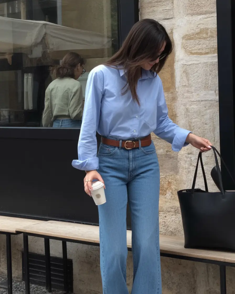 Layering enhances the versatility of soft blue classics. A white or light grey blazer adds structure for office environments, while a cropped cardigan keeps the look relaxed and approachable. Mixing textures such as crisp cotton with soft knit or satin finishes adds depth without disrupting the calm palette. Footwear options like nude flats, white sneakers, or subtle metallic heels maintain the airy aesthetic. Accessories should remain minimal and cohesive, with structured handbags and delicate silver or pearl jewelry enhancing the softness of the outfit.