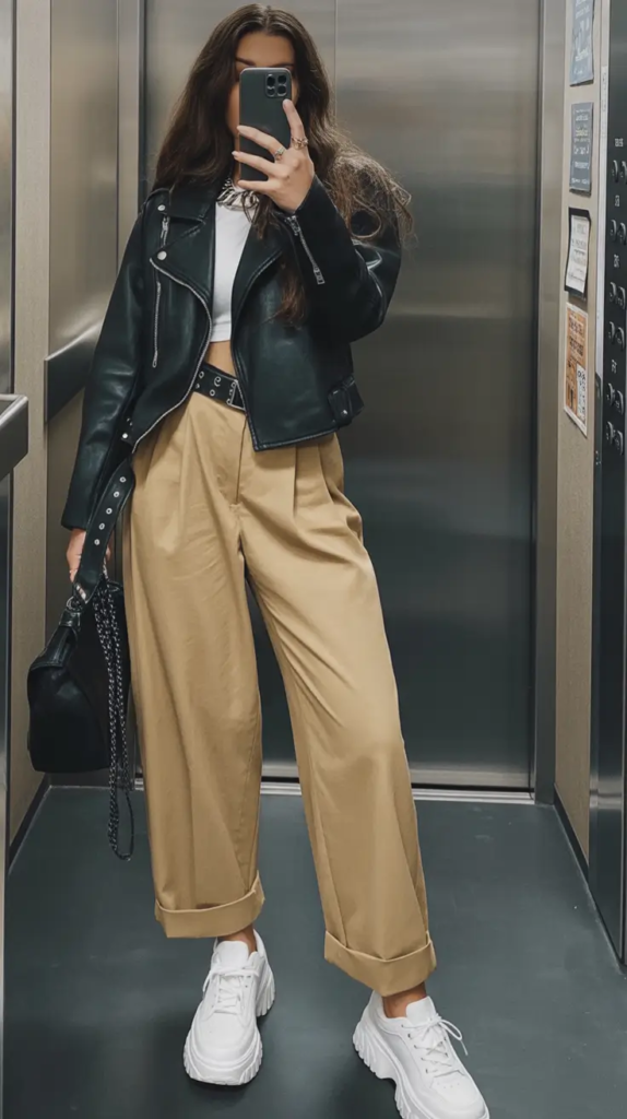 Balancing proportions is essential when styling wide-leg trousers. A fitted or slightly cropped leather piece keeps the silhouette defined and flattering. For layering, consider a lightweight blouse underneath the leather or a tailored blazer over it to refine the look. Footwear should complement the strong lines pointed heels elongate the frame, while sleek ankle boots add confidence and stability. Accessories should remain structured and minimal, allowing the texture contrast between leather and flowing trousers to become the focal point.