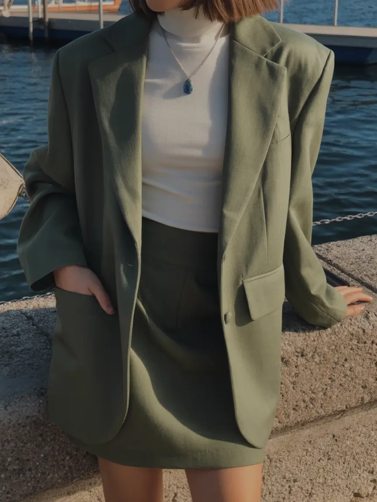 Texture and fit are essential to make soft green suiting feel current rather than corporate. Slightly relaxed tailoring, wide-leg trousers, or cropped hems create movement and prevent the ensemble from appearing rigid. For a softer interpretation, layer the blazer over a fitted knit instead of a structured shirt. Footwear options like nude heels, loafers, or even white sneakers allow flexibility depending on the formality of your day. Accessories should remain understated gold jewelry complements green tones beautifully, while structured handbags maintain the polished finish.