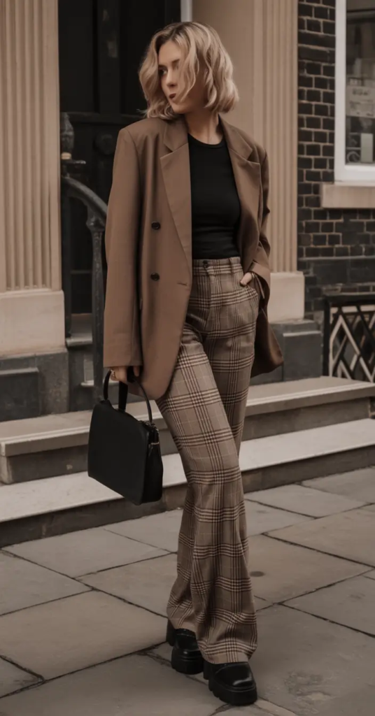 Layering enhances the warmth of this look. A tailored blazer, cropped cardigan, or lightweight trench in complementary earthy shades deepens the color palette and adds dimension. Footwear choices like loafers, ankle boots, or pointed flats align with the polished tone of plaid, while a structured tote reinforces the refined aesthetic. Keeping accessories minimal ensures the plaid pattern remains the focal point without competing elements. Subtle gold or bronze jewelry pairs beautifully with the warm undertones of the outfit.
