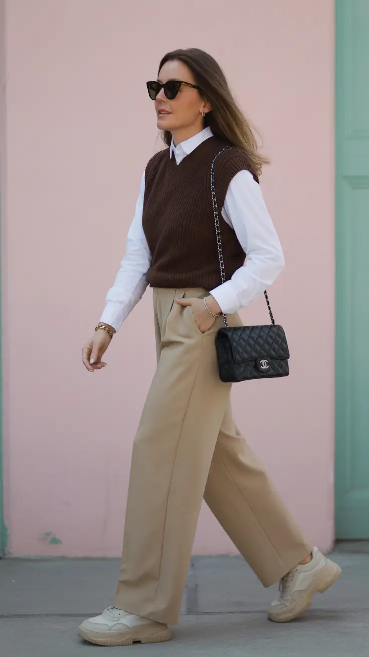 The neutral color palette plays a major role in the appeal of this outfit. Shades like cream, taupe, camel, and soft beige complement the brown vest beautifully and create a cohesive look that feels intentional. Tailored pieces bring structure, helping the outfit feel polished rather than casual. A crisp white shirt layered under the vest adds dimension, while subtle accessories like leather handbags or simple gold jewelry complete the look without overpowering it.
