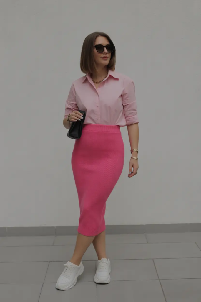 The key to making this outfit work is focusing on fabric and fit. Tailored pink trousers combined with a relaxed pink blouse or structured knit create a refined silhouette. Mixing textures like satin, cotton, and soft knits adds dimension and prevents the look from feeling flat. Neutral accessories such as nude heels, beige handbags, or minimal gold jewelry help ground the outfit while letting the color story remain the focal point.