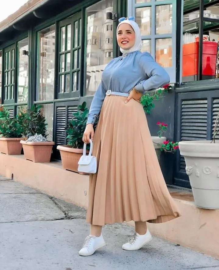 • Soft top + wide-leg trousers + simple hijab