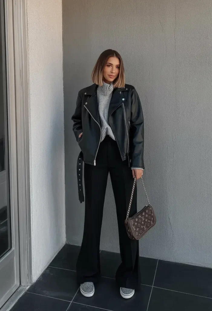From a lifestyle perspective, monochrome leather styling represents confidence through simplicity and balance. It demonstrates how minimal elements can produce powerful visual impact when proportion and material are carefully considered. Pinterest audiences are drawn to this look because it communicates modern sophistication without complexity. A leather jacket within a monochrome palette defines spring strength through clarity, structure, and intentional design.