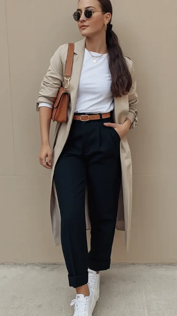 Material quality enhances the trench coat’s enduring appeal. Smooth, structured fabric maintains shape while allowing fluid movement, creating a balanced and composed silhouette. Neutral tones support versatility, enabling seamless integration with various wardrobe elements. Accessories remain subtle, preserving the trench’s visual prominence. The outfit adapts effortlessly to diverse settings, from casual outings to more polished environments, demonstrating remarkable functional range. The trench’s structure ensures clarity while its simplicity ensures timelessness.