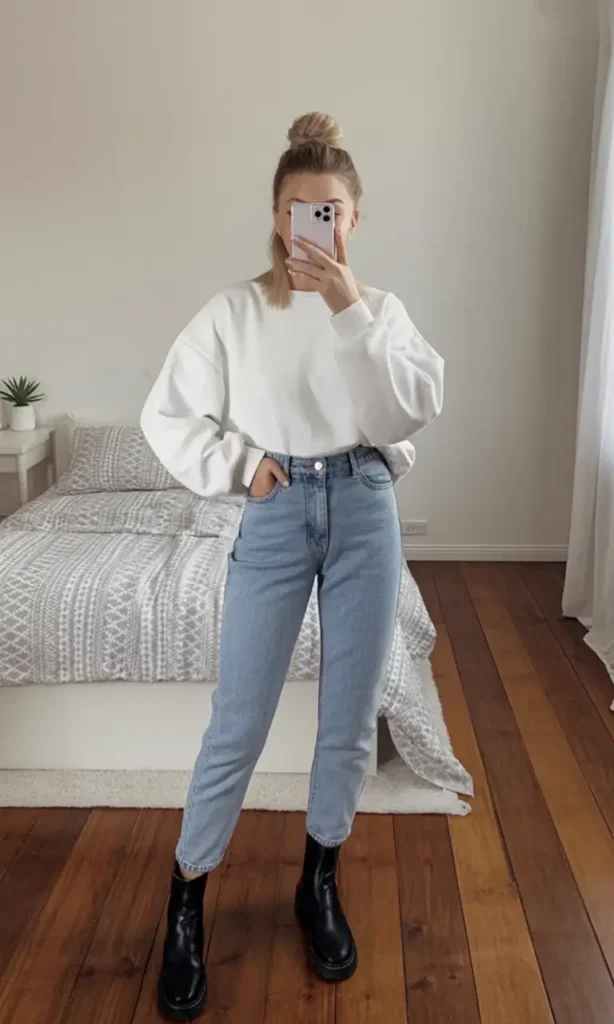 Fabric choice plays an essential role in elevating this outfit from simple to intentionally styled. A structured or slightly oversized sweatshirt creates shape without appearing bulky, while well-fitted light denim maintains clean proportions. Texture contrast enhances visual interest, allowing soft cotton, structured denim, and smooth leather boots to interact naturally. Subtle styling details such as cuffed jeans, minimal jewelry, or a neutral crossbody bag refine the overall presentation without overwhelming the simplicity of the look. Layering options also make this outfit ideal for transitional weather. A tailored coat, lightweight trench, or structured blazer can be added without disrupting the outfit’s balance. This adaptability ensures the look remains functional while preserving aesthetic clarity. The result is an outfit that feels relaxed yet polished, simple yet thoughtfully composed.