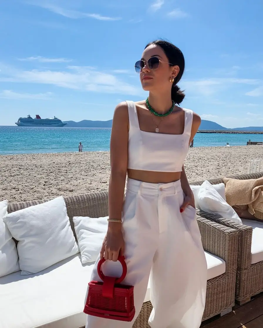 When styling this look, it is important to let the bold accent stand out without overwhelming the outfit. Keeping the rest of the styling minimal allows the contrast to shine while maintaining a clean aesthetic. Soft hair and natural makeup complement the crispness of the white, creating a harmonious and polished appearance. Footwear and accessories should align with the overall tone, adding subtle refinement without competing for attention. This outfit is ideal for women who appreciate minimalism but still want to incorporate a touch of individuality into their beach style.
