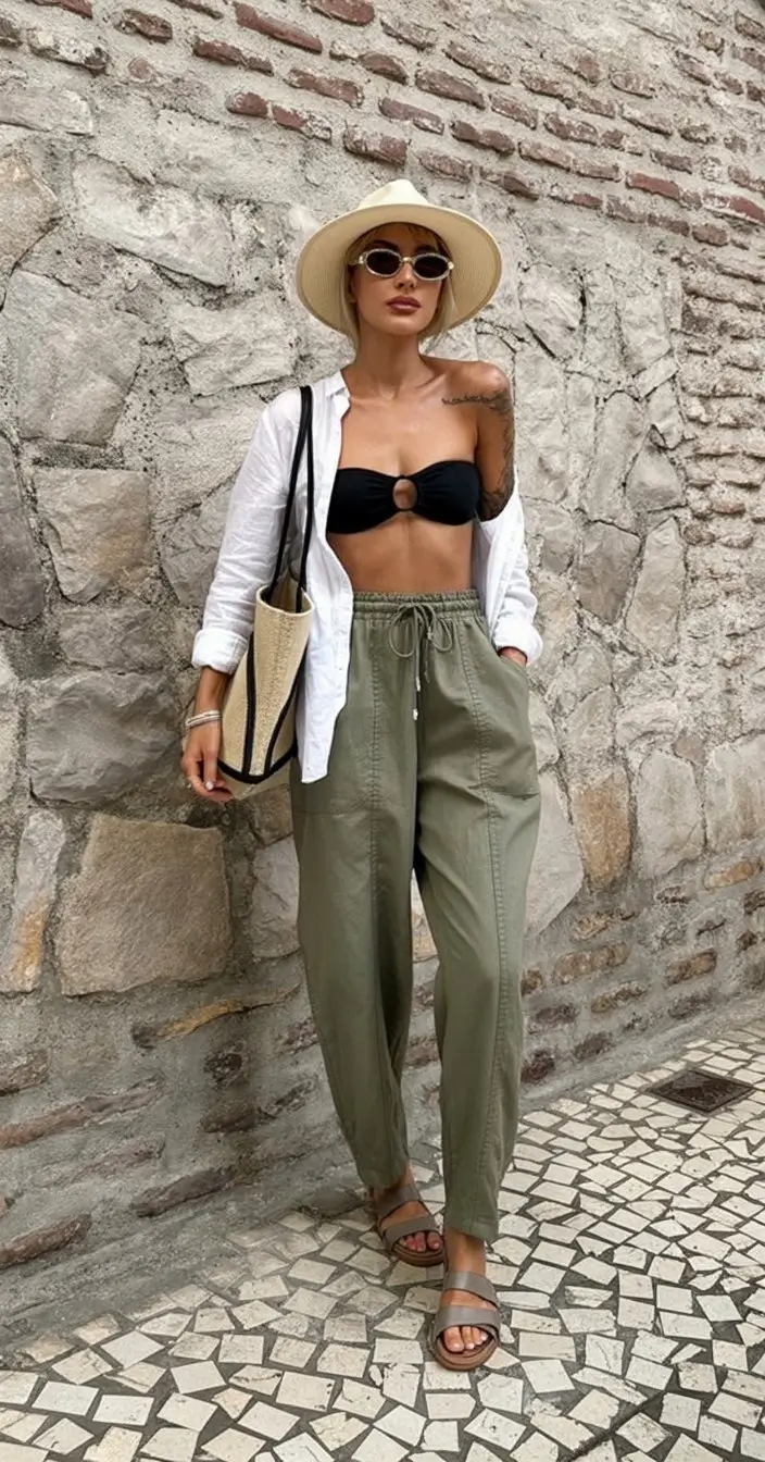 A modern resort mix that combines tailored pants with bold swimwear creates a striking and fashion forward beach outfit. This look blends structure with statement elements, offering a unique approach to beachwear that feels both polished and expressive. Tailored pants provide a refined base, while bold swimwear adds a dynamic and eye catching layer that brings energy to the outfit. The contrast between the structured silhouette and the vibrant or distinctive swimwear creates a balanced yet impactful look.