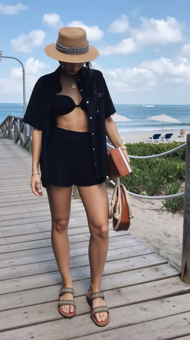 Relaxed black layers bring a unique city inspired edge to beachwear, creating an outfit that feels both casual and confidently styled. This look embraces darker tones in a softer and more relaxed way, allowing black to feel approachable even in a beach setting. Lightweight layers such as loose tops, open shirts, or relaxed outer pieces create movement while maintaining a clean and structured appearance. The overall vibe is effortless, combining urban influence with coastal ease to create a distinctive and modern look.