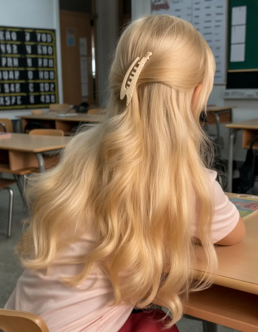 Soft vanilla blonde waves with playful half-up styling strike the perfect balance between relaxed elegance and youthful charm. This hairstyle combines the gentle movement of naturally flowing waves with the added interest of a half-up design, which allows part of the hair to frame the face while the rest cascades freely. The soft vanilla blonde hue offers a creamy, luminous tone that captures sunlight beautifully, highlighting the texture of the waves and creating a warm, radiant glow. To achieve this look, medium to long hair works best, allowing ample length for the waves to flow while the upper section can be pulled back stylishly without appearing tight or restrictive. Styling involves creating loose, soft waves with a curling wand, braids, or twists, then gathering the top half of the hair into a simple knot, clip, or braid for a playful yet refined effect.