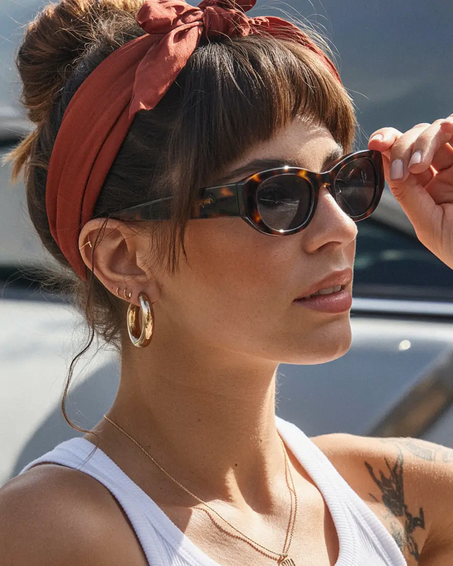 The appeal of a warm-tone bandana with retro edge lies in its versatility. It pairs seamlessly with various hairstyles, from loose waves and straight hair to low buns or ponytails, making it ideal for everyday wear. Bandanas can be styled with subtle knots, twists, or drapes, allowing the wearer to personalize the look while maintaining a polished finish. Accessorizing with simple gold jewelry, sunglasses, or woven handbags enhances the retro flair without overpowering the outfit. Pinterest users love this style because it is playful, approachable, and instantly adds personality to any summer ensemble, making it perfect for casual adventures, picnics, or street-style photoshoots.